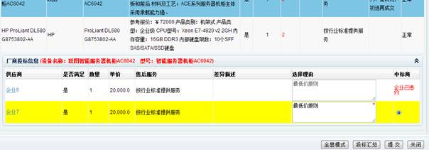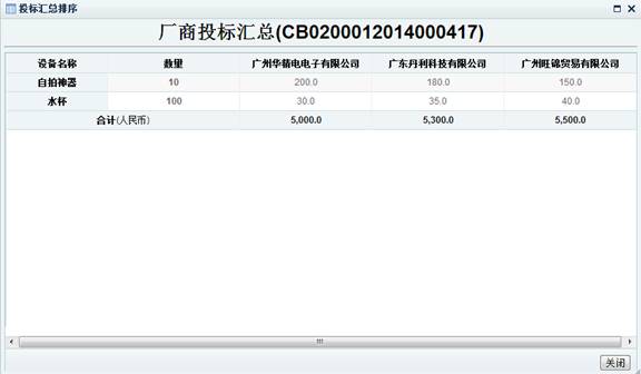 投标汇总是将该申购单所有参与竞价的供应商按投标总价排序显示,提供给申购用户做初选参考,参考界面如下图所示: