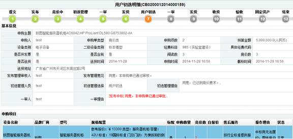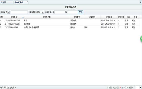 用户初选模块基本功能包括:初选中标单位,填写初选意见,提交采购与招投标管理中心一审。如果采购与招投标管理中心审核通过,则进入厂家发货,申购用户收货环节。