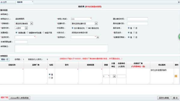 (5)所有申购项目中自报价总价不能超过学校规定额度(默认为10万元人民币,可以参数控制);