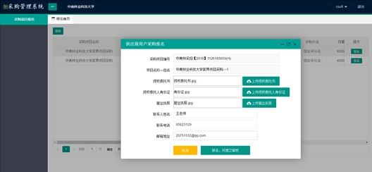 供应商完成注册之后,学校政府采购与招投标管理中心工作人员将对供应商注册信息进行审核,审核通过之后的供应商即可用自己注册的用户名和密码,进行采购项目的报名。供应商注册审核联系电话:85658775(崔老师)